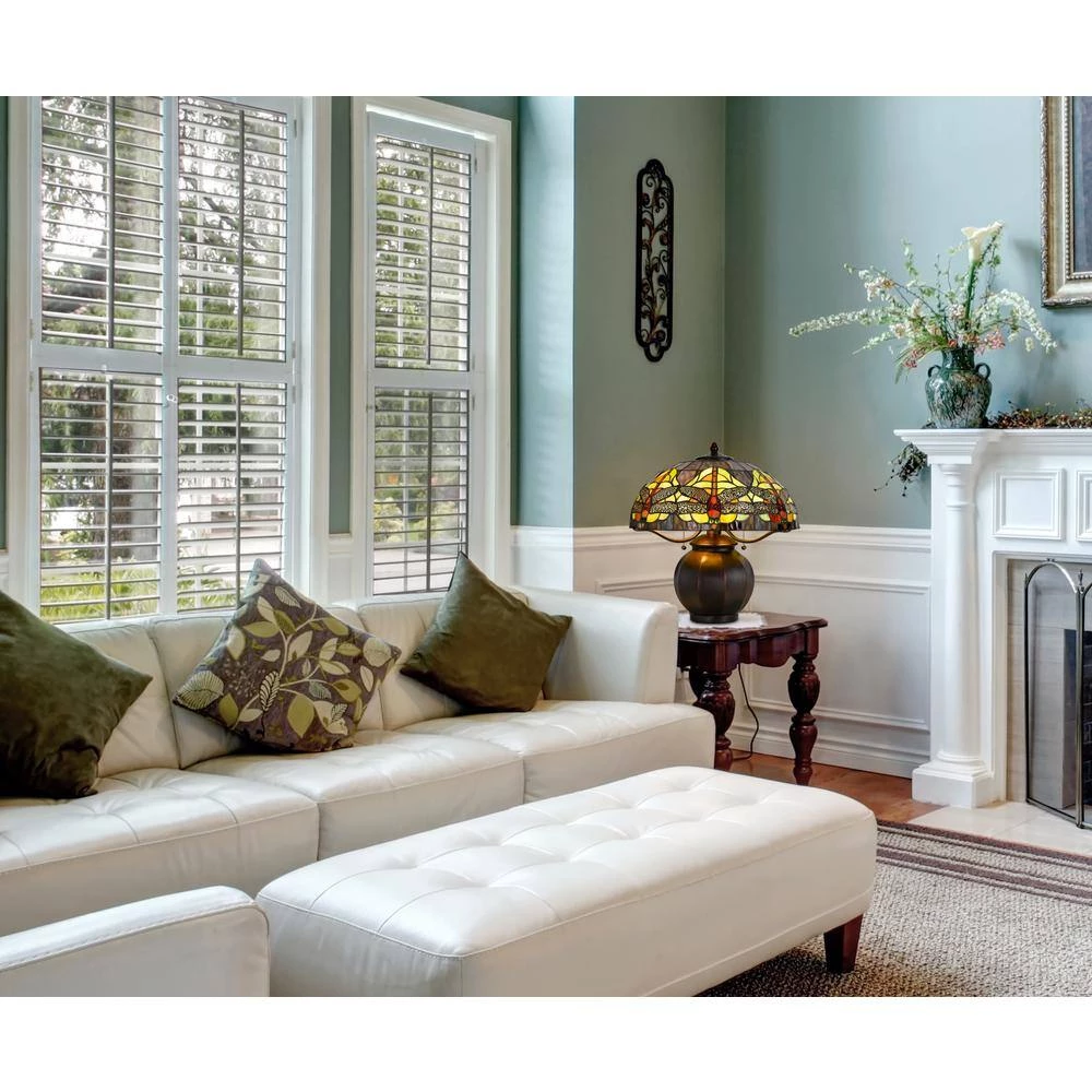 Add a touch of color to your decor with this Art color glass tiffany lamp. It features a stained glass Dragon Fly design and a dark bronze metal and resin body. The lamp has rounded faceted base and a double pull chain with ball tips for easy access.