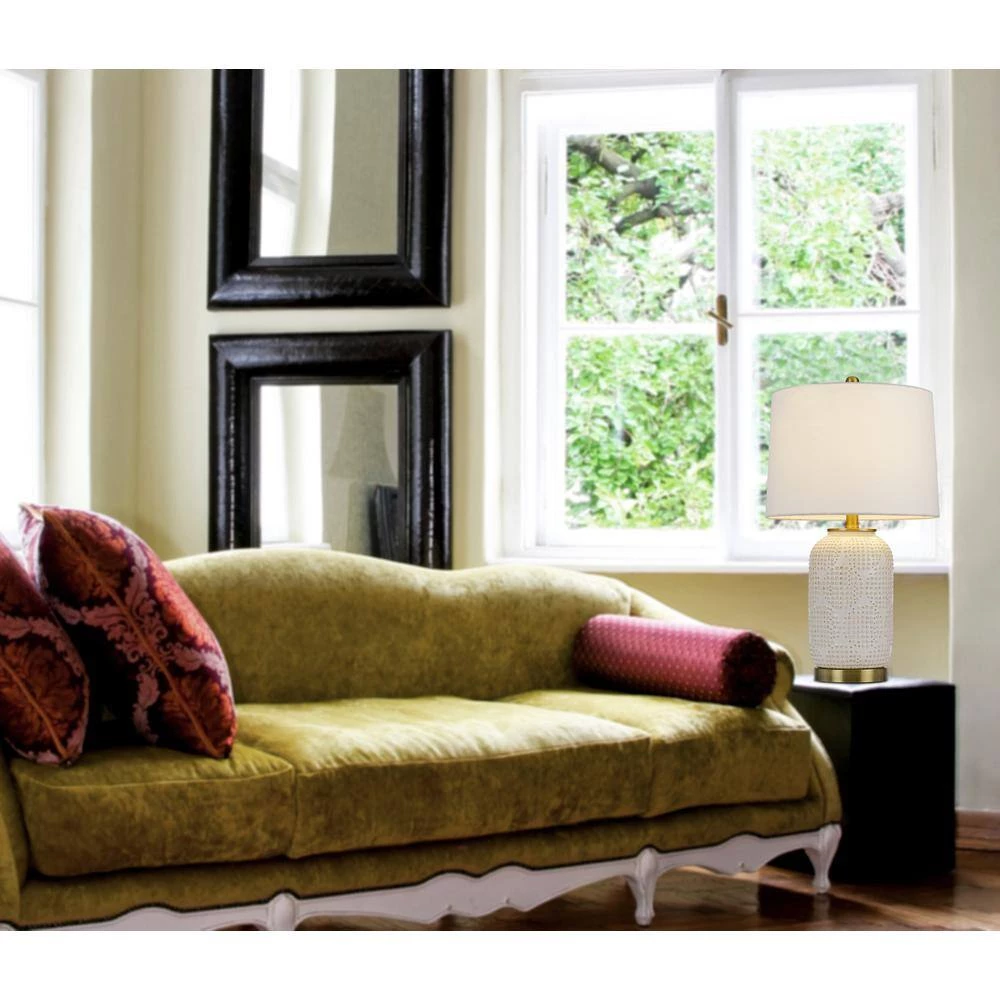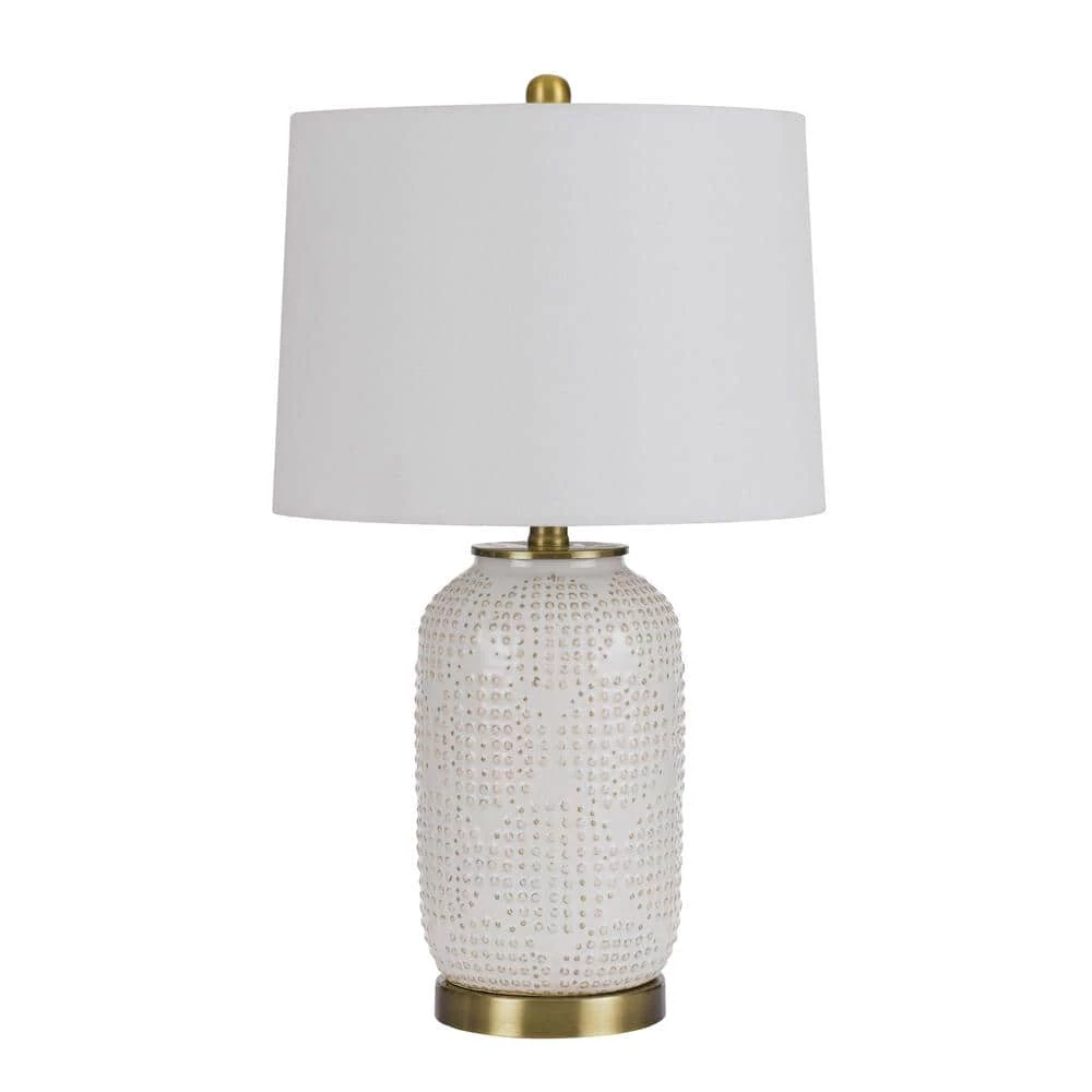 Update your room’s look with this milky ivory ceramic table lamp. It features a texturized circular pattern on the lamp body which adds decorative touch. The lamp is set on a brushed antique brass platform and the look is finished off with a crisp white fabric shade.