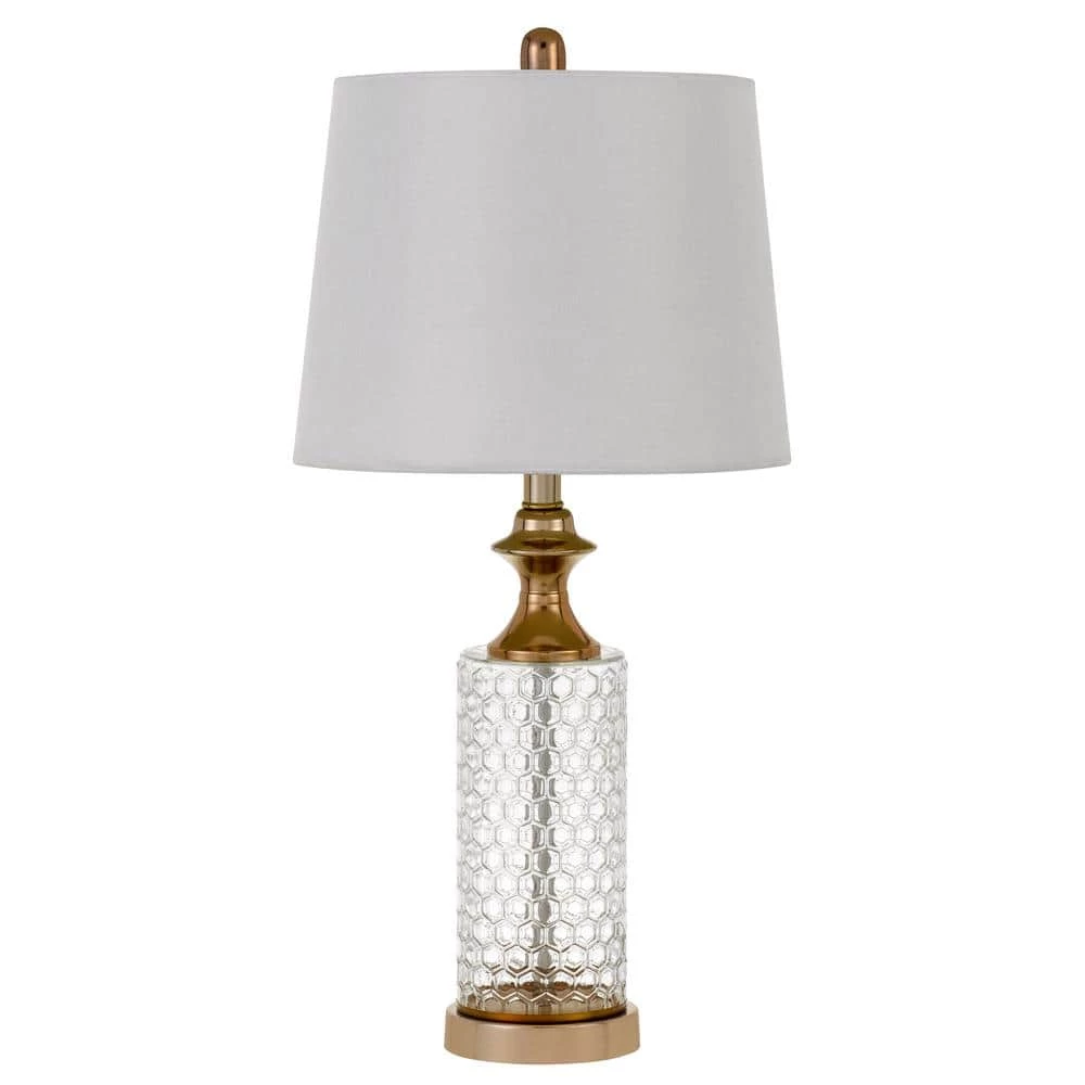 Update your decor with this pair of clear glass cylinder style table lamps. They feature an engraved honeycomb glass pattern set upon a satin copper base and body. The lamps ship complete with hardback fabric shades and matching finials.