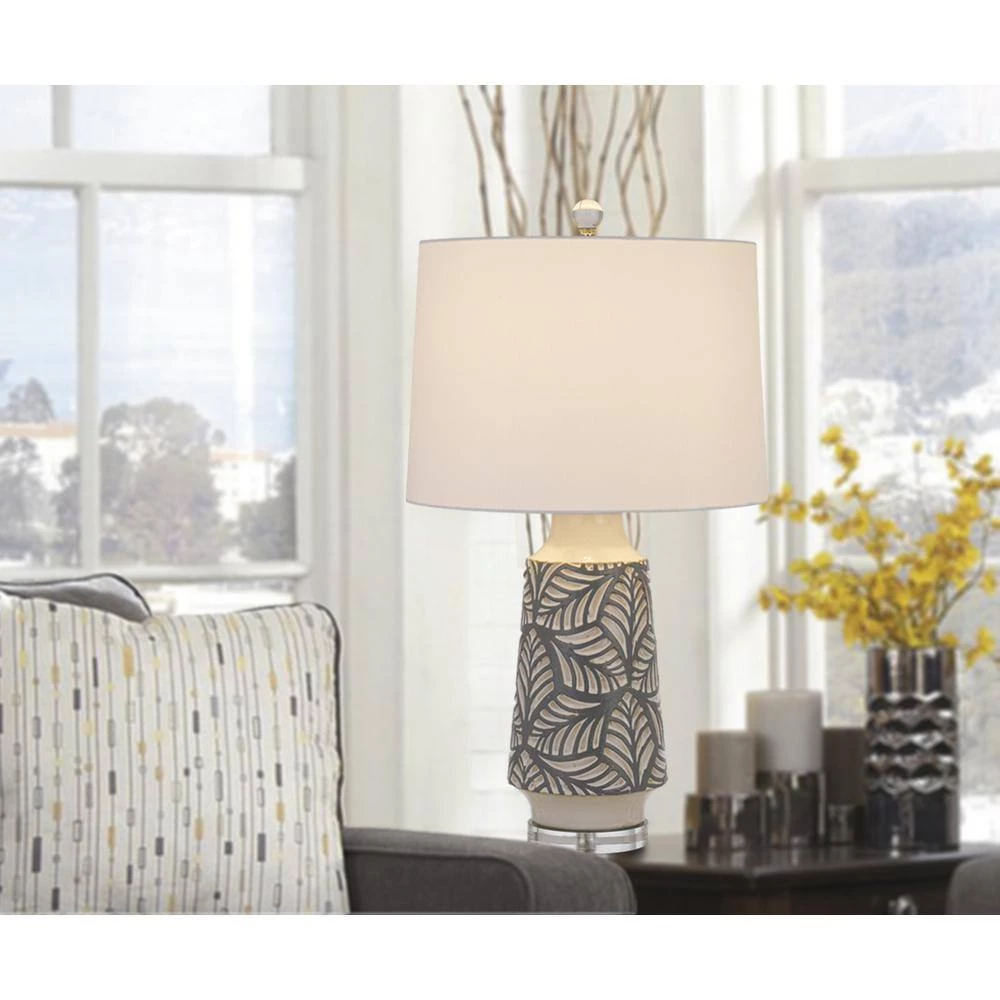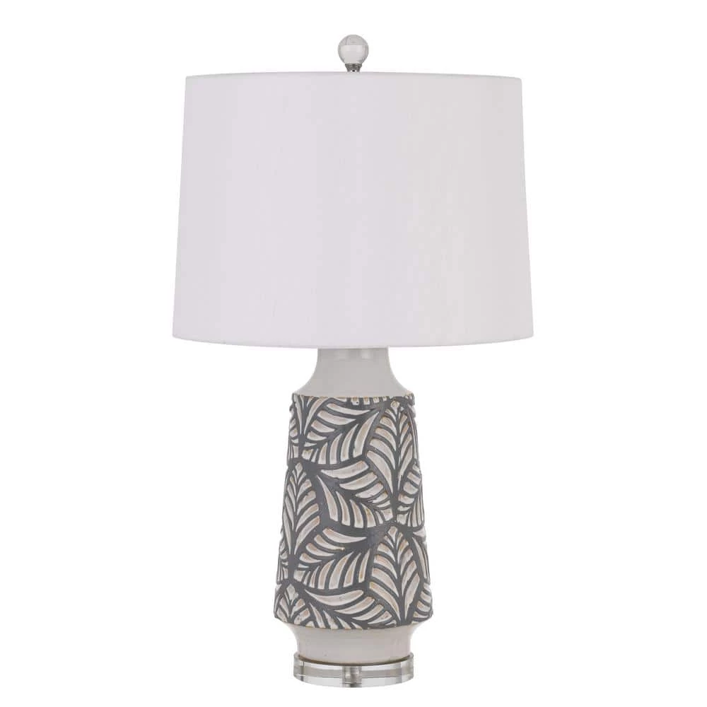 Add A Tropical Vibe To Your Space With This White Ceramic Leaf Print Table Lamp. It Features A Milky Ceramic Finish With Gray Painted Accents And Solid Crystal Base. The Look Is Completed With A White Fabric Shade And Matching Finial.