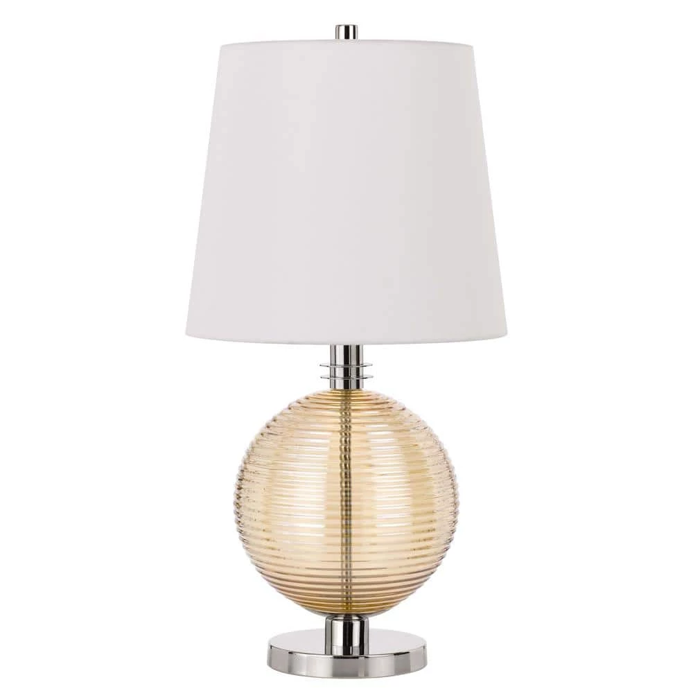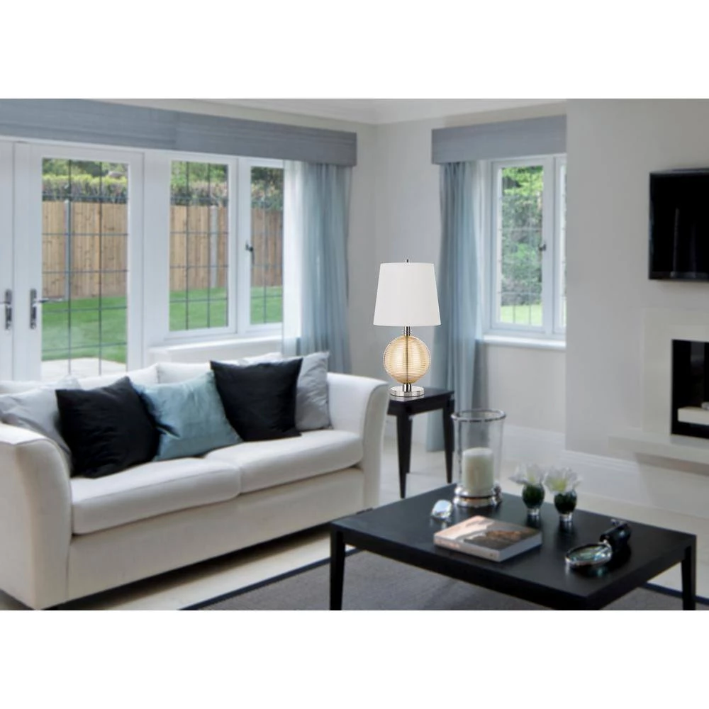 Add a soft touch of color any living room or bedside table in your house. This hand blown glass table lamp features a smoky amber tone circular lamp body with a rippled smooth finish. It is set upon a chrome metal base and finished off with a white hardback linen shade.