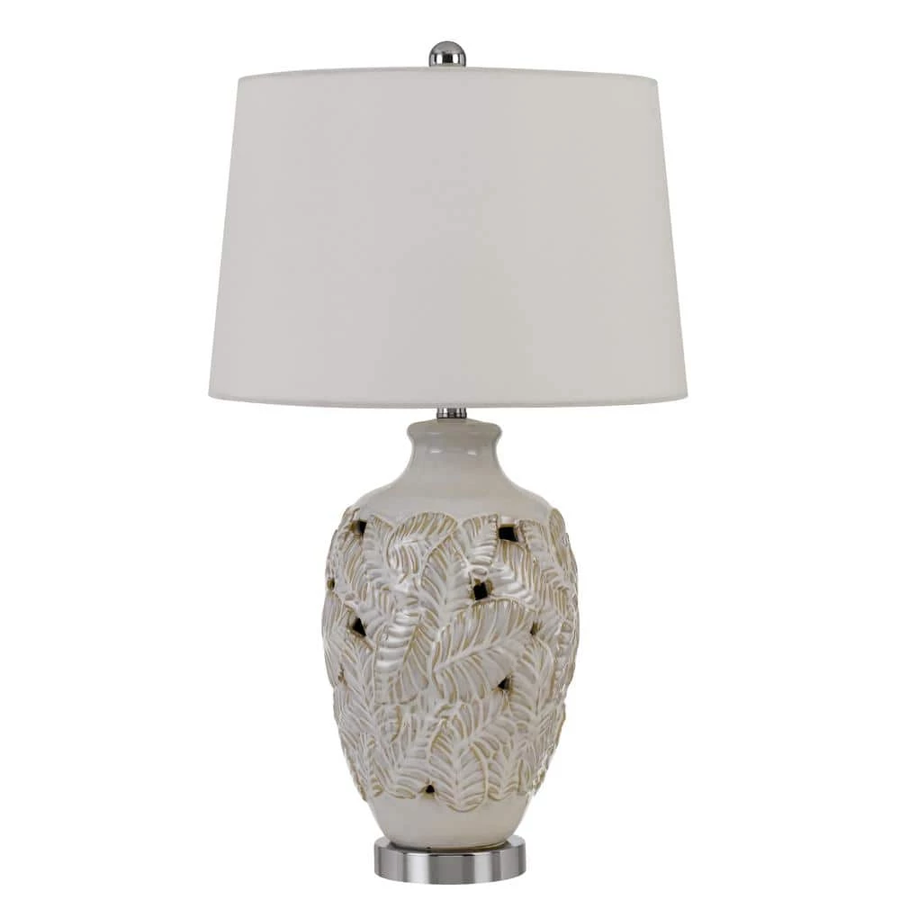 Update your decor with this urn style ceramic table lamp. It features a glazed ivory finish with a golden leaf design. It ships complete with a hardback fabric shade and matching finial.