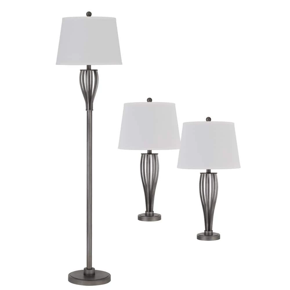 Update your decor with this coordinating set of metal lamps. This 3-piece table and floor lamp set features a floor lamp and 2 table lamps set in a antique silver finish. With their slim frame and contemporary design, they are work well in small spaces and are versatile enough to work with many styles.