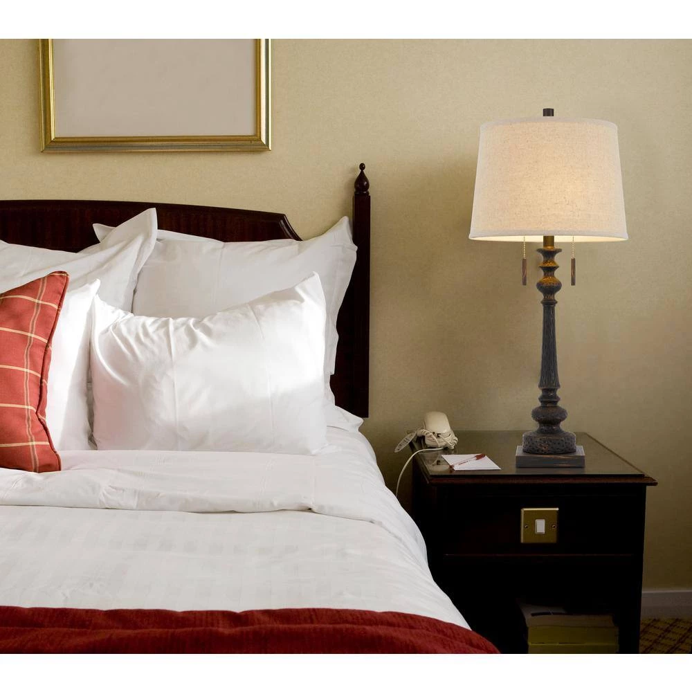 Add a rustic touch to your space with this rustic iron resin table lamp. It features a matte hammered finish on a slim pole style body. It has a pull chain on/off design and round hardback fabric shade completes the look.