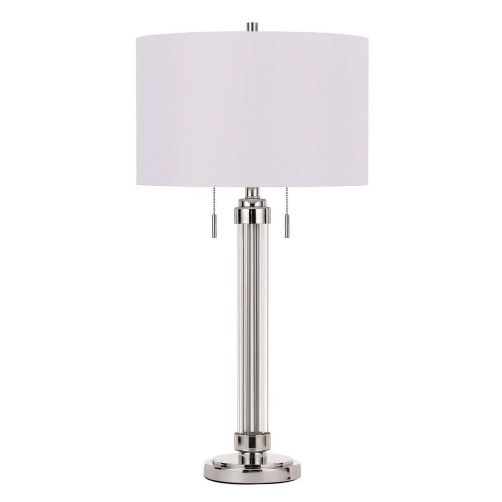 The 60-Watt Montilla Table Lamp has a Metal/Glass Material with a Brushed Steel Finish. It is Crafted with an Acrylic Outer Shell and it is Beautifully Constructed with Durable Metal. It has a Sensible Style to Impress any Room Area in your Home.