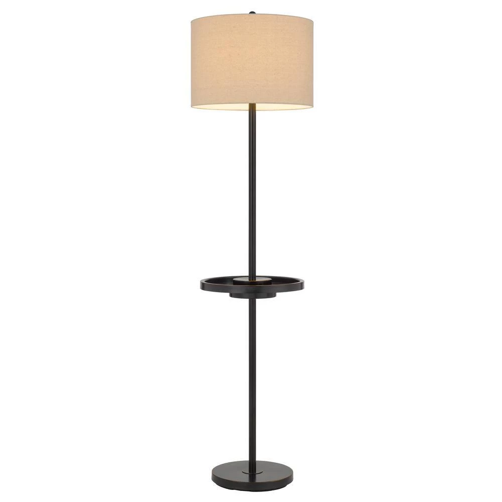 Crofton Metal Floor Lamp with Metal Tray Table and 2 USB Charging Ports and a Weight Base. It has Beautiful Features of a Slim Pole Style Frame and Efficient Lighting of 150-Watt. It has a Dark Bronze Finish Color and a Hardback Linen Shade.
