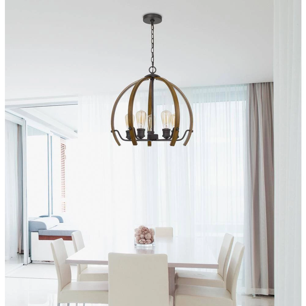 Add a modern touch to your space with this 2-tone circle chandelier. It features a brushed steel laser cut geometric pattern mixed with a light oak wooden frame. The fixture ships complete with matching canopy and 6 ft. of chain.