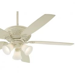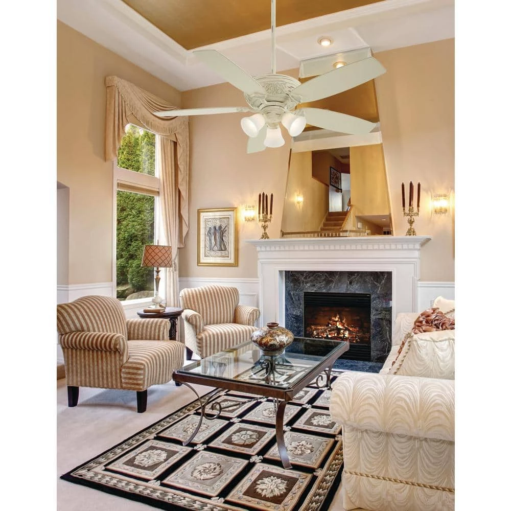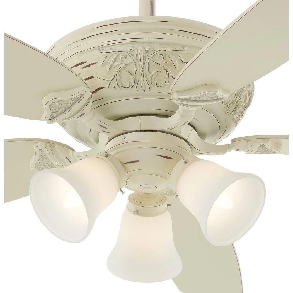 Old world hand-painted finish accentuates the hand-carved details to create a traditional European style fan. Classica the Gallery Edition by Minka Aire is designed with a smooth Provencal Blanc finish. Equipped with five blades with a 54-inch span and a 9-degree pitch, it generates up to a maximum 4,878 CFM for optimal air flow. Includes a three-speed forward/reverse remote control with on/off full range light dimmer and three 4-watt dimmable Candelabra Integrated LED bulbs for optimum illumination. Whether traditional, classical or contemporary, this drop-down mounted Classica is ready to make your room a more stylish and comfortable living space. The Classica Gallery Edition, designed by MINKA-AIRE is truly a classic work of art