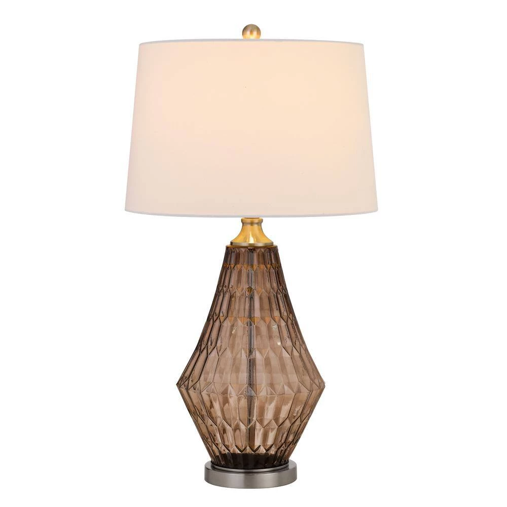 Illuminate Your Space with this Concave Patterned Smoked Glass Table Lamp. It Features AaWide Bottom Diamond Silhouette, Circular Platform and it is Topped with a White Fabric Hardback Shade. All Contents Ship Securely in 1-Box.