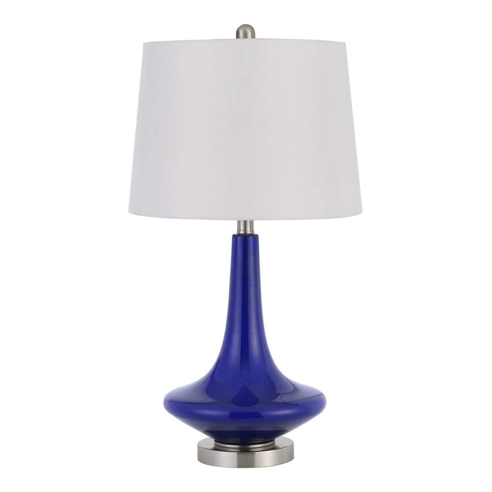 Update your decor with this set of royal blue glass table lamps. They feature a wide bottom and slender neck set upon a satin nickel weighted base and frame. The lamps ship complete with white hardback fabric shades and matching finials.