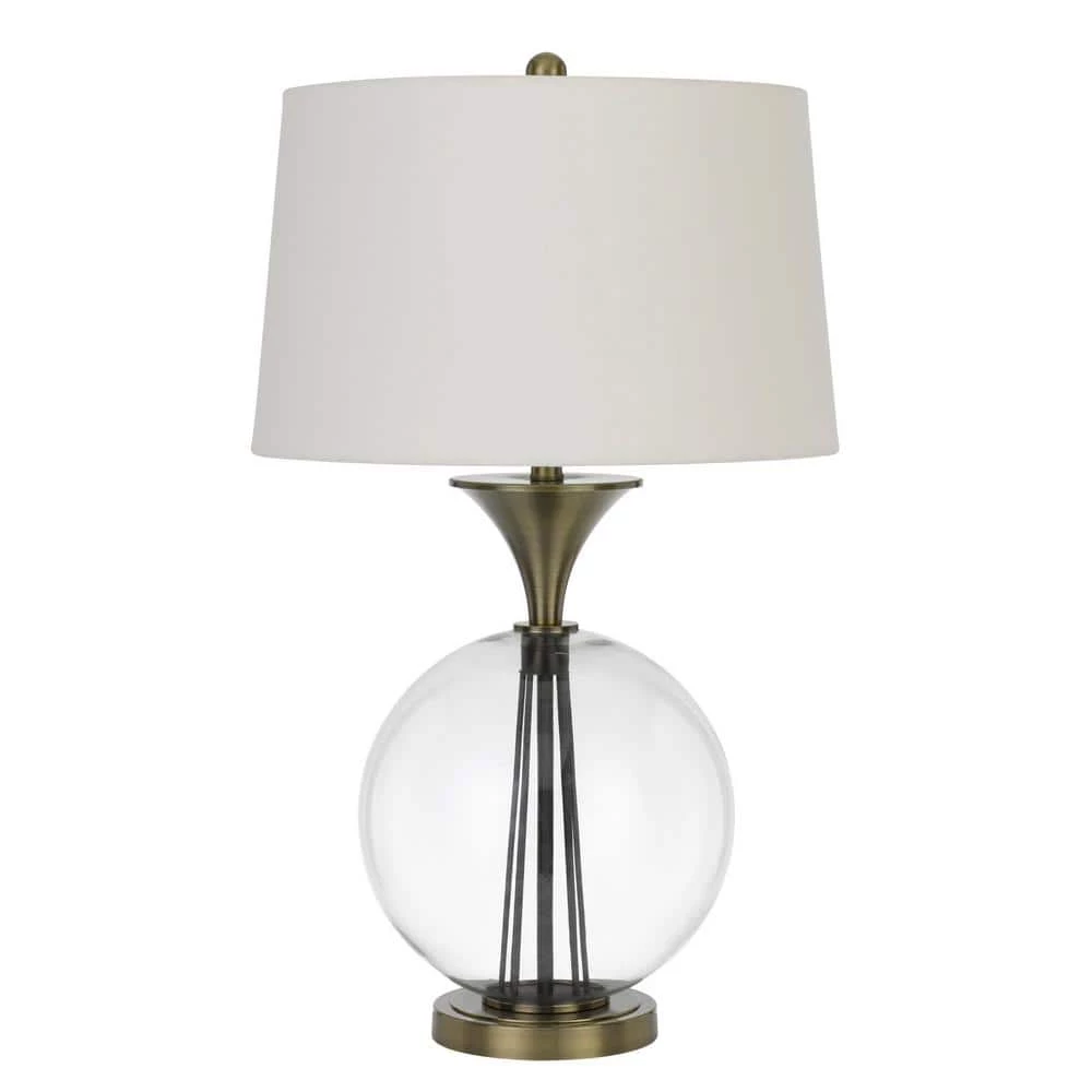 The 30 in. Moxee Glass/Metal Table Lamp has a Beautiful Clear Round Glass Finish Mixed with Antique Brass. It Provides 150W of Warm Essential Lighting and Has a Weighted Base for Support. It Has Beautiful Features such as a Polished Steel Body and a Hardback Taper Drum Fabric Shade.