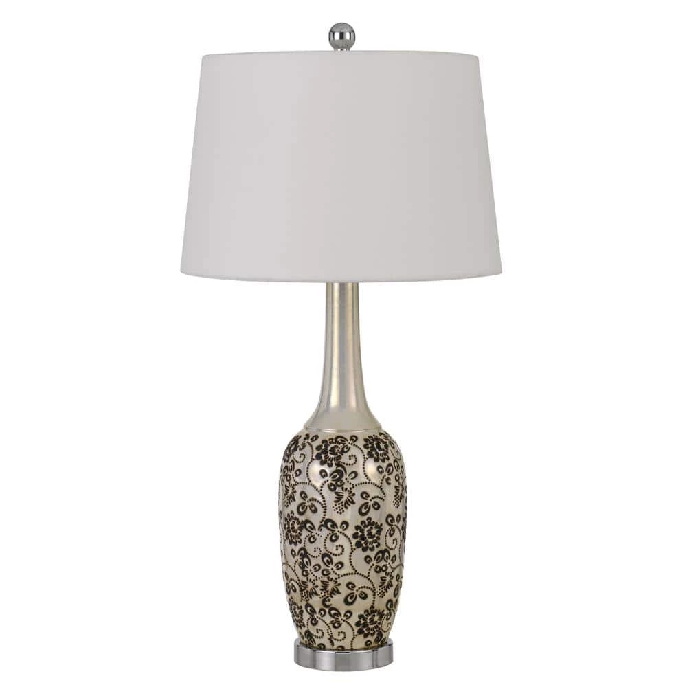 Update your decor with this long neck style glass table lamp. It features an iridescent pearl finish stamped with a black floral pattern design. The lamp ships complete with a hardback fabric shade and matching finial.