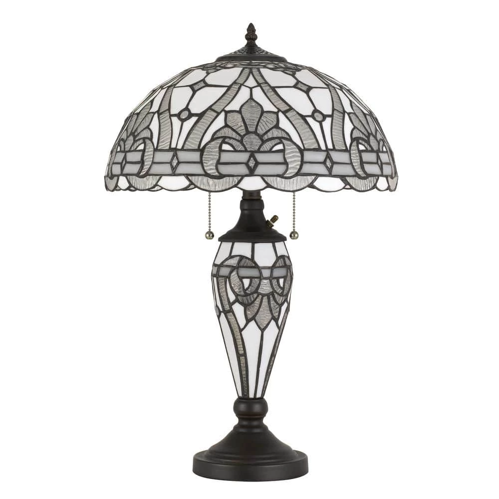 Update your decor with this stunning tiffany style table lamp with night light. It features an ornate floral style pattern design set upon a black metal finish base. This timeless piece is sure to add a touch of timeless elegance to any room in your home.